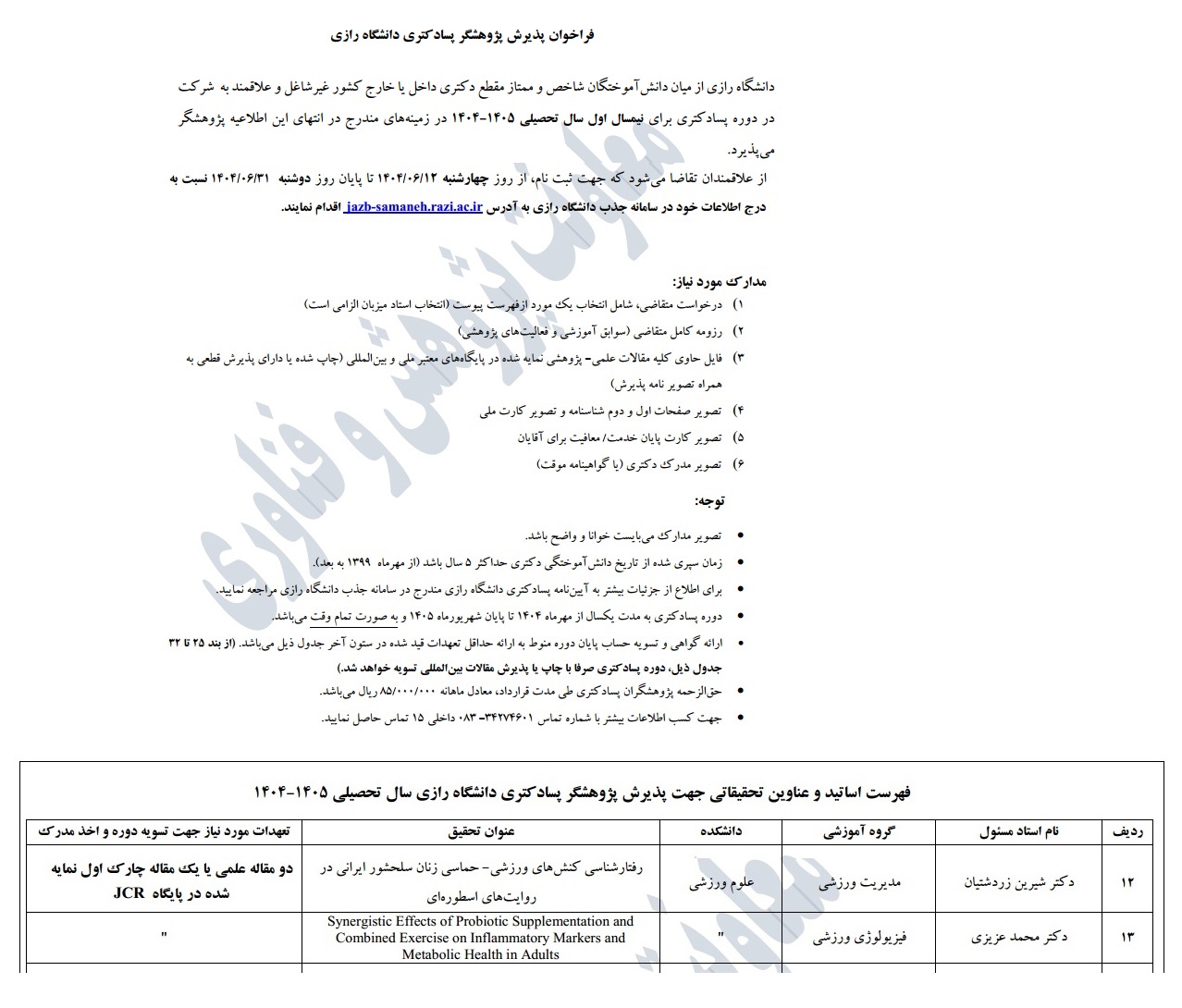 فراخوان جذب پژوهشگر پسادکتری دانشگاه رازی - دانشکده تربیت بدنی و علوم ورزشی