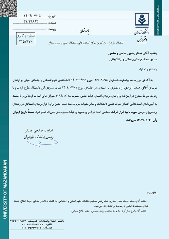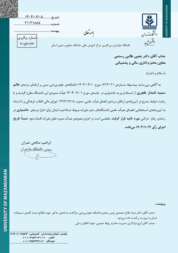 ارتقای مرتبه علمی 2 عضو هیات علمی دانشگاه مازندران - دانشگاه مازندران